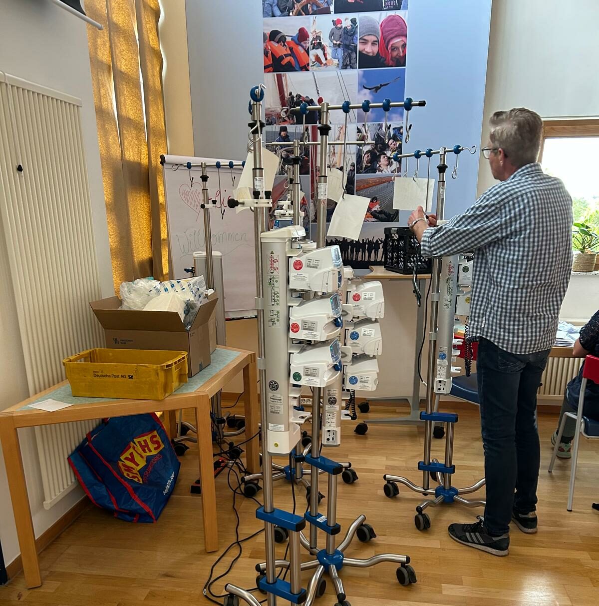 Bereits um 9:00 Uhr trafen die Kinder im Elternhaus ein. In der vierten Etage wurde ein provisorischer „Arzt- und Pflegestützpunkt“ eingerichtet, in dem die Kinder medizinisch versorgt und an ihre Infusionen angeschlossen wurden. Danach konnten sie im Spielzimmer zur Ruhe kommen und spielen.