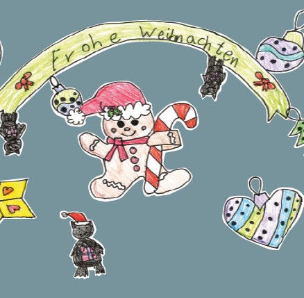 Eines der Bilder wird ausgewählt, um auf unserer Weihnachtskarte abgedruckt zu werden. In diesem Jahr schmückt der entzückende Lebkuchenmann der 8-jährigen Mia die Vorderseite. Fröhlich überbringt er die Weihnachtsgrüße des Fördervereins an seine Mitglieder und Spender. Er ist wirklich zum Anbeißen!