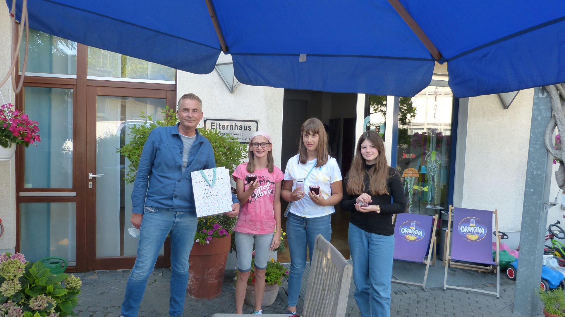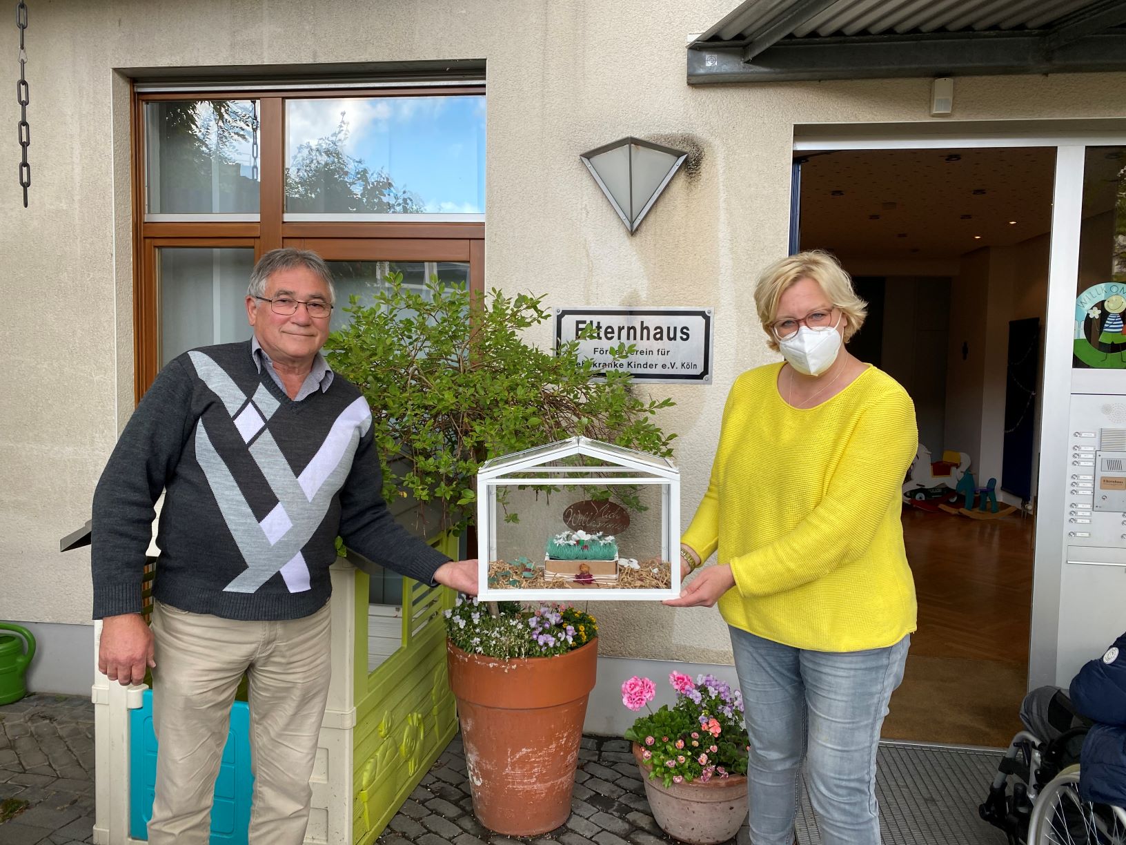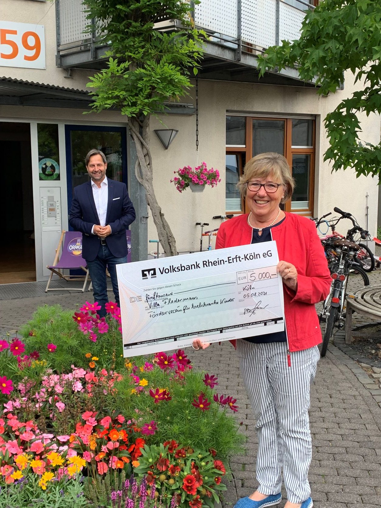 Um die „Villa Fledermaus“ zu einem Ort zu machen, an dem sich unsere Familien geborgen fühlen, braucht es viele wunderbare Menschen. Diese fanden wir auch in der Volksbank Rhein-Erft-Köln, denn der Vorstand sagte uns spontan eine Spende von 5.000 € zu. Überbracht wurde uns der Spendenscheck vom Vorstandsmitglied Markus Bärenfänger. Anfang August traf er dazu die Vorsitzende Marlene Merhar vorm Elternhaus, um mehr über das Projekt und die Arbeit des Fördervereins zu erfahren.