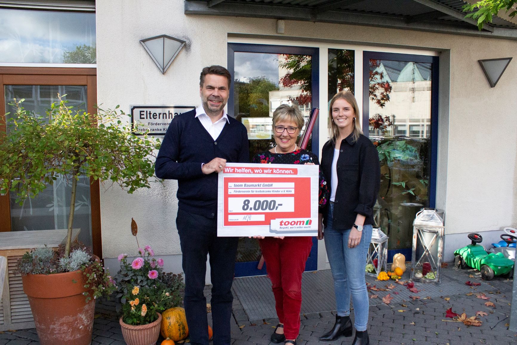 Am vergangenen Freitag, den 18.Oktober 2019, besuchten Geschäftsführer Niko Johns und Christina Waibel, Trainee in der Personalabteilung und zuständig für die Organisation des B2Run, das Elternhaus und übergaben den Spendenscheck symbolisch an Marlene Merhar, Vorsitzende des Vereins. „Ich kann mir kaum vorstellen, was Familien, in der eine Krebsdiagnose gestellt wurde, durchmachen. Das vielfältige Engagement des Vereins beeindruckt mich sehr, gerade wenn den Betroffenen schnell und unbürokratisch geholfen wird. Daher ist die Unterstützung des Fördervereins für mich eine Herzensangelegenheit“, betonte Niko Johns. Beim B2Run übernimmt toom nicht nur die Startgebühr für jeden Mitarbeiter, sondern spendet zusätzlich pro Kollege, der ins Ziel läuft, an den Förderverein. In diesem Jahr sind 116 Kollegen für den guten Zweck an den Start gegangen. „Ich hoffe sehr, dass wir diese Zahl im nächsten Jahr noch toppen können“, erzählte Christina Waibel. „Denn der Firmenlauf verbindet – abseits vom Job – die gemeinsame Freude am Laufen mit den Kollegen mit der Möglichkeit, Gutes zu tun. Die hohe Spendensumme in diesem Jahr freut mich daher sehr.“