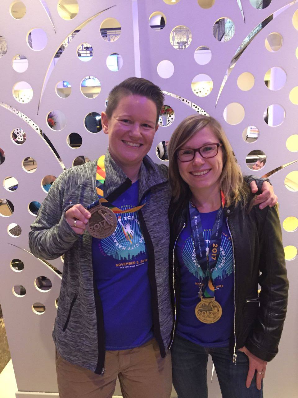 Der große Tag rückte näher. Um 6 Uhr morgens wurden wir mit dem Bus im Hotel abgeholt und mit insgesamt über 50000 anderen Läufern nach Staten Island gefahren. In unserem Starting Village mussten wir fast vier Stunden bis zum Startschuss warten, aber die Stimmung der anderen Läufer zog uns schnell in den Bann. Dass Marathon in Amerika etwas ganz anderes bedeutet als hier wurde uns spätestens klar, als alle Läufer um uns herum aufstanden und applaudierten. Was war los? Teilnehmer in Rollstühlen, auf Krücken, Blinde, Beinamputierte begaben sich in ihre Startposition. Ältere Herren im Rollstuhl, die von älteren Damen geschoben wurden und umgekehrt. So etwas hatten wir hier noch bei keinem Marathon erlebt. Wir hatten auch noch nie so viele Menschen gesehen, die für einen guten Zweck laufen oder als Tribut an einen verstorbenen Verwandten oder Freund. Und dann ging es auch für uns los. Bei 13 Grad und Nieselregen fiel der Startschuss und es ging los über die Verrazano Narrows Bridge hinüber nach Brooklyn und von da weiter durch Queens, Bronx und am Ende zum Zieleinlauf in den Central Park in Manhattan. Nadine lief und lief und lief. Die letzten Kilometer zogen sich für sie wirklich. Aber immer wieder wie ein Mantra ging es durch ihren Kopf „Nur Fledermäuse lassen sich hängen.“ Nach 4:21:12 Stunden war sie glücklich im Ziel. Für Johanne, die von ihrem Arzt strengstes Laufverbot erhalten hatte, aber die Option zu gehen, dauerte es länger, aber auch sie hat es in 6:58:29 Stunden glücklich geschafft.