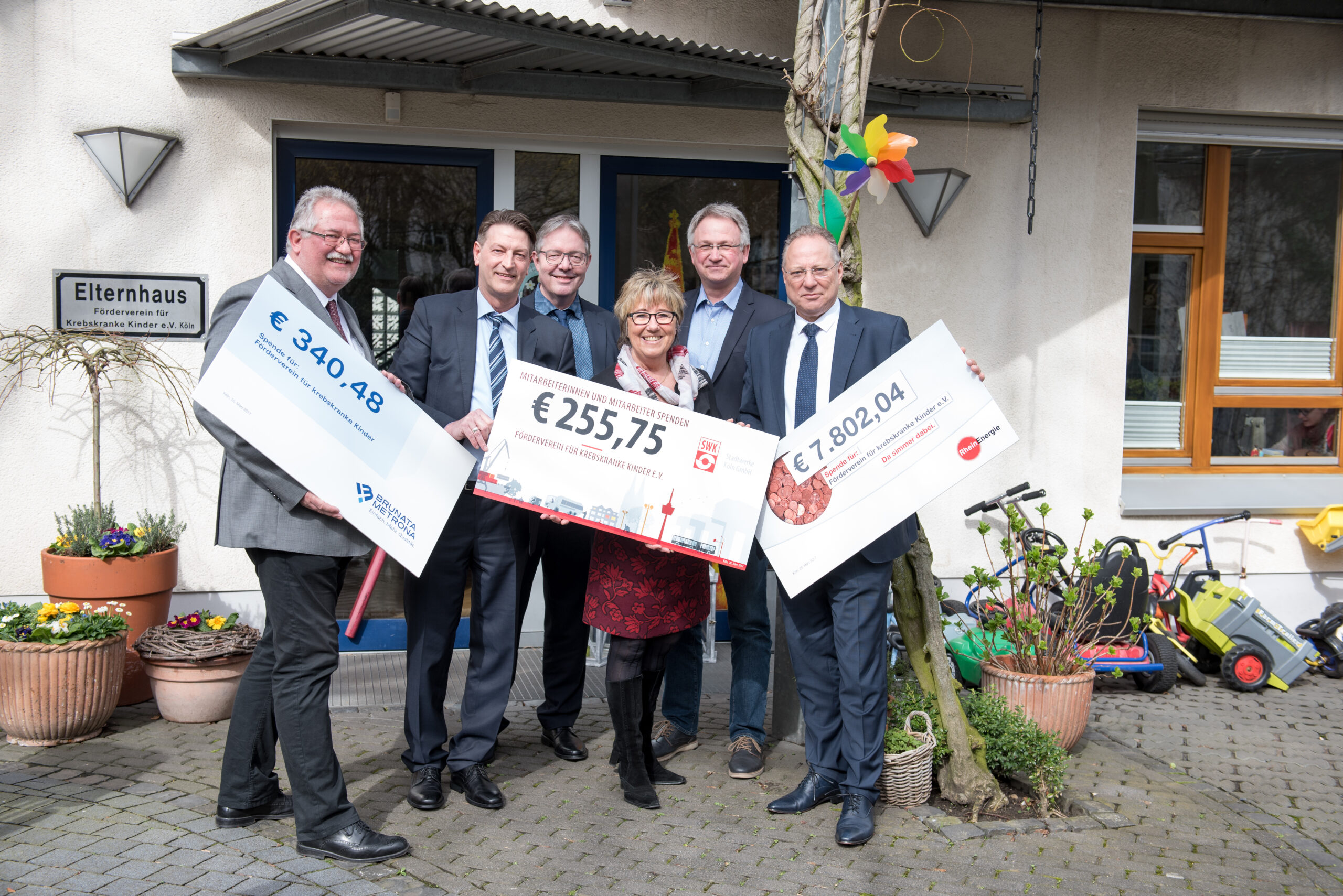 Norbert Kasten, Betriebsratsvorsitzender Brunata, Wilfried Teschner, Betriebsratsvorsitzender SWK, Rainer Plaßmann, Personalleiter SWK, Marlene Merhar, Vorsitzende des Fördervereins für krebskranke Kinder, Wolfgang Nolden, Betriebsratsvorsitzender RheinEnergie, Norbert Graefrath, Arbeitsdirektor RheinEnergie.