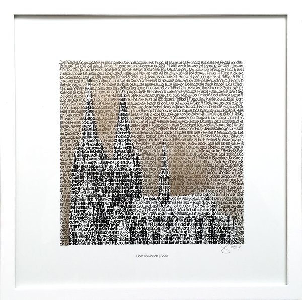 Darüber hinaus unterstützt uns Sascha auch als Künstler mit einer langfristigen Spendenaktion. Unter seinem Künstlernamen SAXA schafft er seit vielen Jahren außergewöhnliche Bilder, die er selbst Wortmalereien nennt. Mittlerweile sind seine Arbeiten regelmäßig im In- und Ausland auf renommierten Kunstmessen wie der Art Karlsruhe und der ART.FAIR in Köln sowie in Ausstellungen und Sammlungen zu finden. Ein Motiv lässt dabei in jeder Hinsicht unser kölsches Herz höher schlagen: der Dom op kölsch – der Kölner Dom, geschrieben aus den Worten des kölschen Grundgesetzes. Von jedem verkauften Bild erhalten wir 10 % des Erlöses, wodurch bereits eine stattliche Summe zusammengekommen ist.